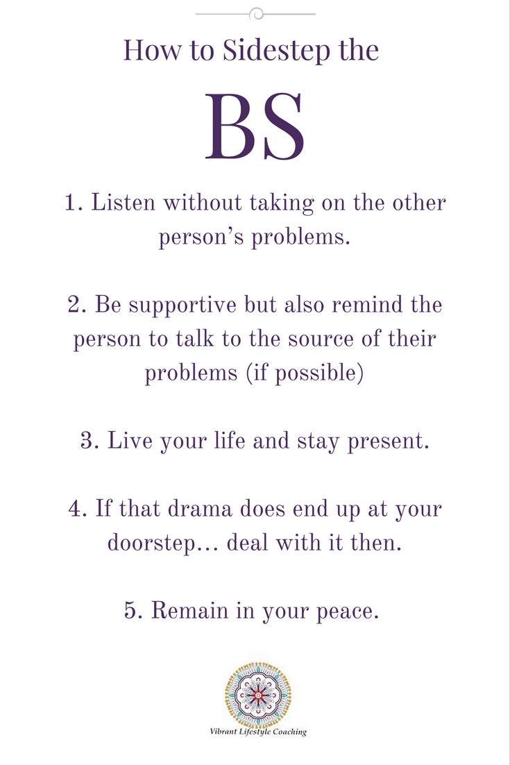 If you’re wondering, the BS never ended up coming her way. The two women finally addressed their issues with each other and figured out a way to handle their conflict. By sidestepping the bs my client was able to stay focused on her goals, not take on any unnecessary stress and worry while maintaining her peace and ultimately still being a good friend.